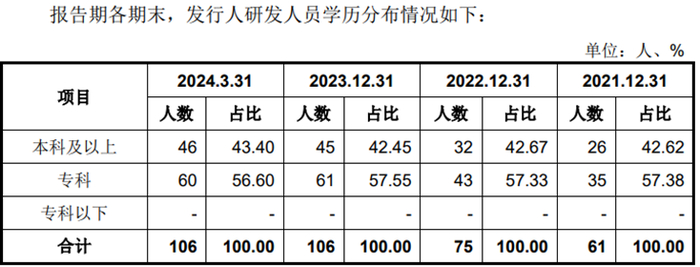但是该公司的106名研发人员中,专科学历人数多达61人、占比为57.55%,全公司本科以上学历人员占比才刚过20%,是不是有点奇怪?