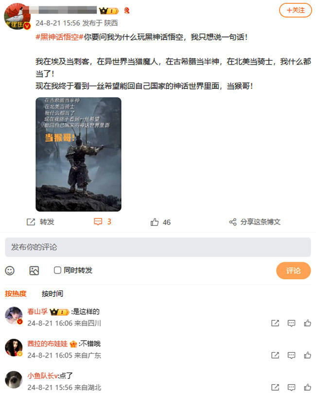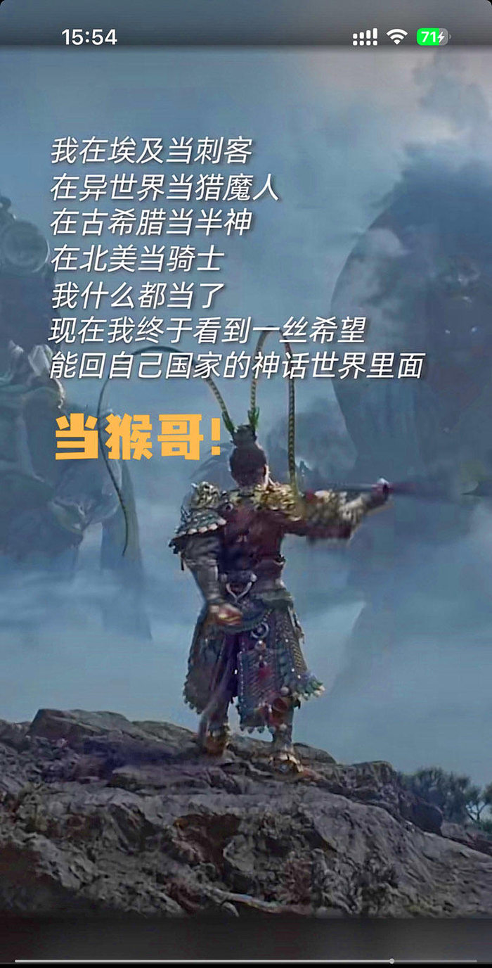 “我在埃及当刺客,在异世界当猎魔人,当猎龙者,当骑士,什么都当了。现在我终于看到一丝希望,我能回自己国家的异世界当猴哥。”2020年8月20日,《黑神话:悟空》首个实机视频发布后,评论区中出现这样一段话。