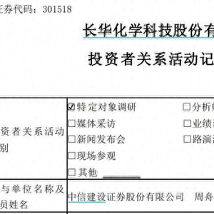 【环球网财经综合报道】9月12日晚间,上市公司长华化学(301518.SZ)发布了《投资者关系活动记录表》,披露接待了中信建设证券的现场调研,公司财务总监,董事会秘书等多位高管参与并解答提问。
