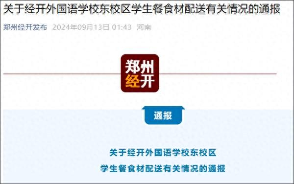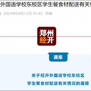 据河南郑州经济技术开发区管理委员会微信公众号“郑州经开发布”9月13日消息,郑州经济技术开发区教育文化体育局12日发布关于经开外国语学校东校区学生餐食材配送有关情况的通报。
