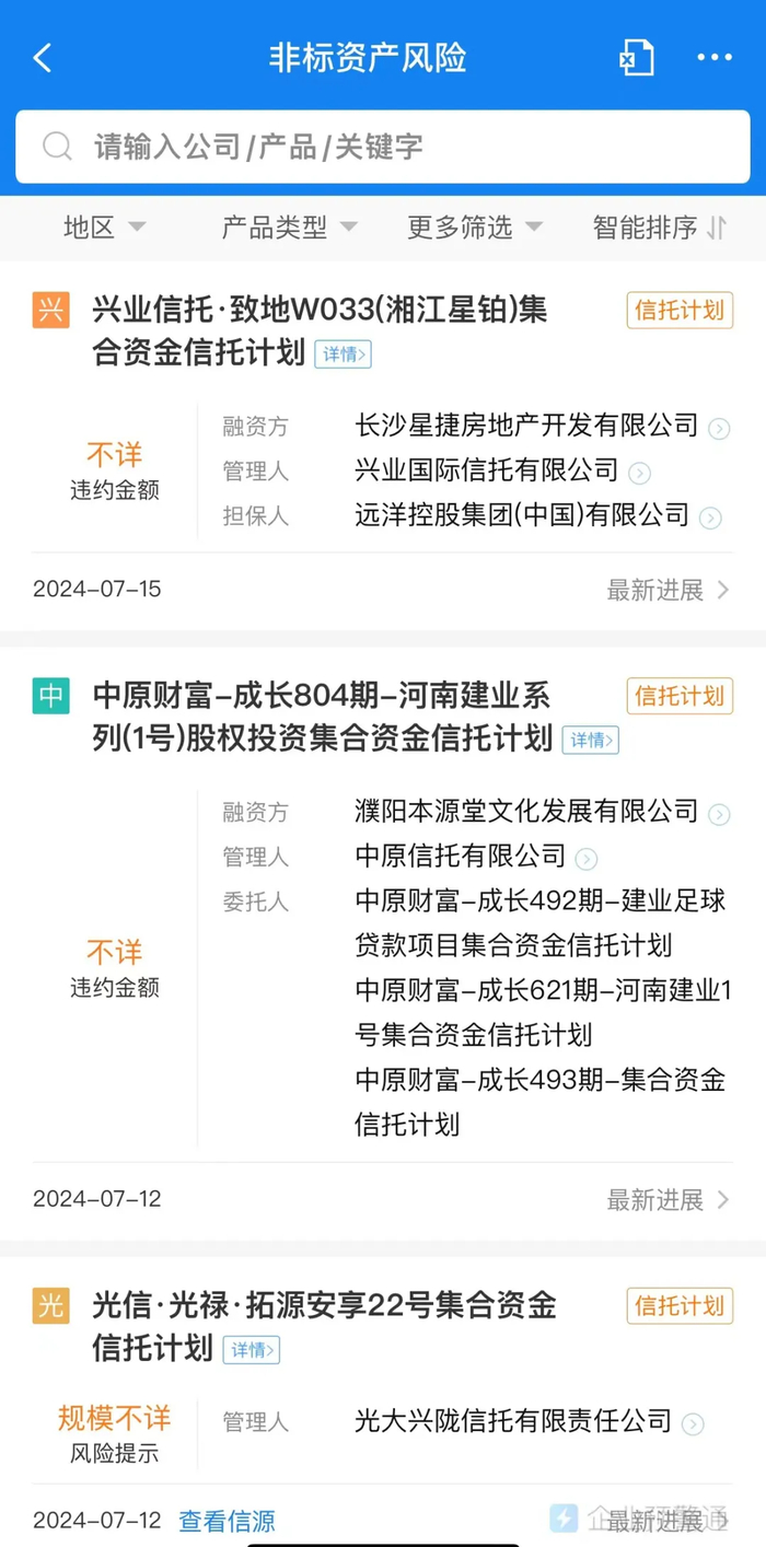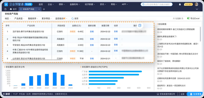 搜索【非标资产风险】,可自定义筛选产品类型、日期、地区等信息,右上角一键导出