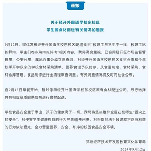 9月12日,有网友发视频称,河南省郑州经济技术开发区外国语学校存在教师和学生饮食待遇不公的情况。9月13日,郑州经开区官微发布了郑州经济技术开发区教育文化体育局关于经开外国语学校东校区学生餐食材配送有关情况的通报。