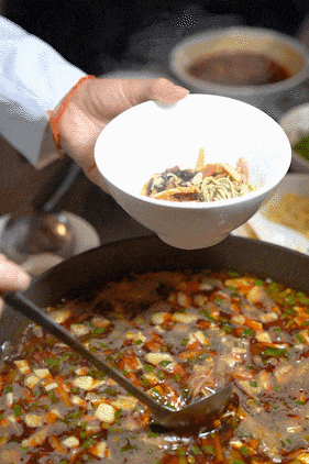 涮好的羊肉蘸着一碗油泼辣子,羊肉的每一丝纹理都裹满了辣椒,满口都是香气。