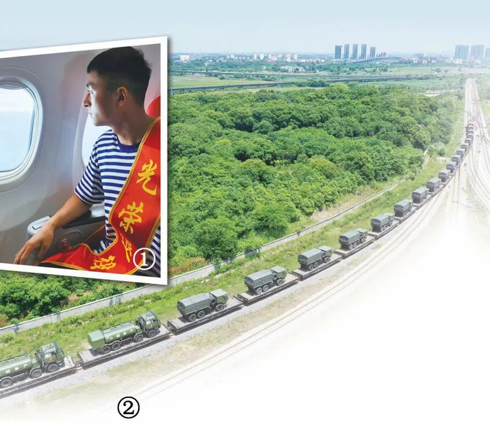 图①:南部战区某调度中心所属军代室协调搭载海岛退伍老兵的民航飞机绕岛飞行。图为一位退伍老兵从空中凝望海岛。图②:南部战区某调度中心所属军代室组织任务部队开展铁路运输投送训练。