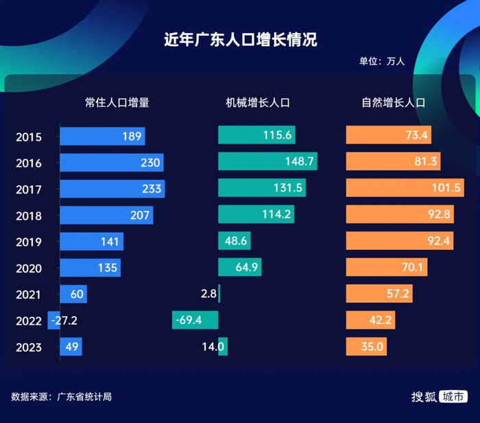 上一个十年,广东凭借强大的经济实力和产业布局,成为最具人口吸引力的省份——2010-2020年常住人口增长2183万,其中自然增长人口849万,机械增长人口1334万。