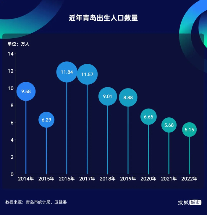 根据2022年数据,青岛出生人口5.15万,出生率6.12‰,低于山东(6.71‰)和全国(6.77‰)。2023年出生数据尚未公布,但根据官方“预计2024年出生人口将与去年持平或略高于去年”的表述,预计去年出生人口约为4.7万,较全面二胎政策释放后缩水了60%以上。
