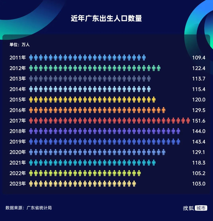 2023年,广东出生人口103万人,出生率高达8.12‰,连续四年成为唯一一个出生人口超100万的省份,连续六年成为第一生育大省。