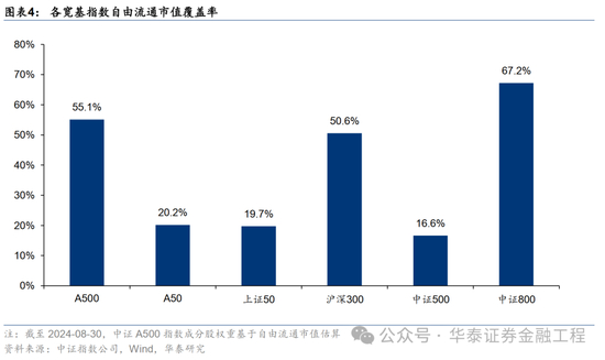 统计各指数相对中证全指的市值覆盖率,中证A500成分股总自由流通市值占中证全指的55.1%,具有良好的市值覆盖度。