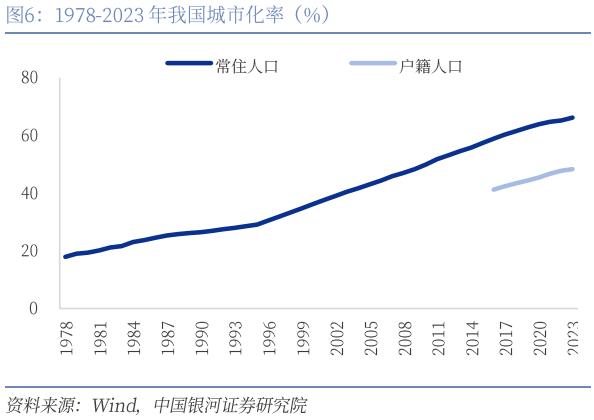 对比世界主要发达国家,我国城镇化率还有较大提升空间。随着乡城人口迁移政策的逐渐放开,我国的城镇化率得到大幅提升,常住人口城镇化率常住人口城镇化率由1978年的17.9%快速增长到2023年的66.16%,户籍人口城镇化率由2016年的41.2%增长到2023年的48.3%,累计增长了7.1个百分点。但由于我国城市地区的落户门槛限制,以及户籍身份和公共服务、子女教育、医疗、社保的绑定,使得大量的外出农民工无法在城市落户。我国的城镇化率尤其是户籍人口城镇化率和其他国家相比存在较大差距。以户籍人口城镇化率为例,我国户籍人口城镇化率比日本低了43.7个百分点,比美国低了35个百分点。此外,还需要关注的是近年来我国常住人口城镇化率和户籍人口城镇化率之间的差距呈进一步扩大趋势,彰显了深化户籍制度改革的必要性。
