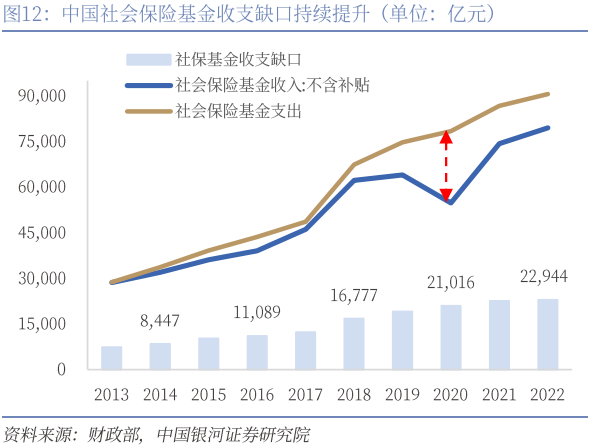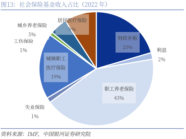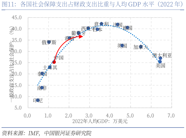 · “以人为本”的新型城镇化需要未来大幅提升社保支出规模:过去我国财政用于基建支出占总支出比重长期在40%以上,而社保相关支出占比则在30%以下。从国际经验来看,伴随人均GDP水平的提升,社会保障支出占财政支出比例相应提升。按照“十四五”提到的远景目标规划,到2035年我国要进入中等发达国家行列,意味着人均GDP水平将由2022年的1.27万美元提升至2.5万美元,而相应的我国社会保障支出占比或需由目前25%左右上升至35%以上,对应相关支出年化增速或在10%以上。相应地,伴随当前我国硬性基础设施建设已较为健全,未来基建总体规模和占比或将逐步降低。