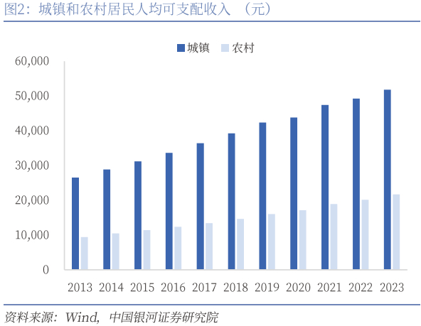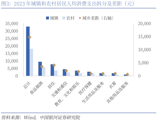 城镇化将带来万亿级的新增需求。消费需求看,一方面,相比农村地区,城市地区工资水平更高且就业机会更多,乡城人口迁移可以进一步提升农业转移人口的绝对收入水平和收入的稳定性。此外,城市地区在社保、教育等领域更好的公共服务供给也减轻了农业转移人口的储蓄倾向。两方面因素的共同作用有助于提升农业转移人口的消费意愿和能力,进一步扩大居民消费需求。数据显示,农村居民的收入和城市相比还存在较大差距,2023年差距为3万元。从支出视角看,城乡居民年支出差距为1.5万元,其中在食品烟酒、居住、交通和通信、教育文化和娱乐领域的支出差距在千元以上。农业转移人口通过高质量的市民化在提高收入的同时,在上述领域的消费需求有望进一步扩大。如果市民化可以使得其消费支出和城镇居民保持一致,则城镇化率每提升1个百分点,新增消费需求约为2000亿元,和国家发改委测算的数据也较为吻合。
