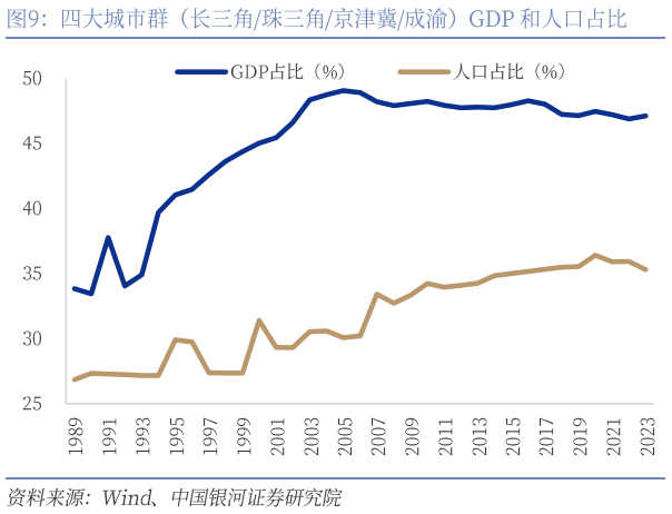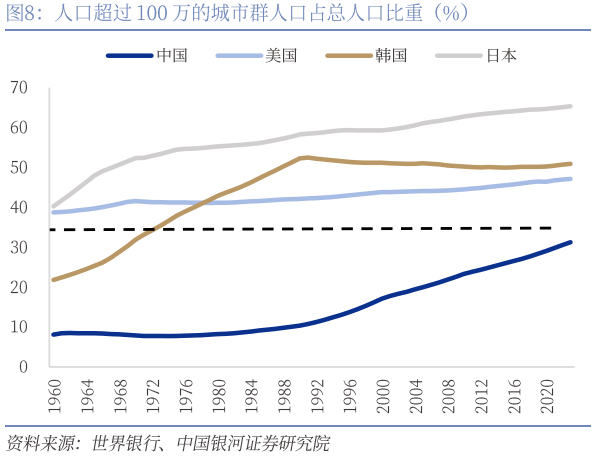 为进一步提升我国城镇化率水平,《计划》明确提出用5年左右的时间将城镇化率提升至接近70%。为实现该目标提出的核心举措有两点:一是进一步深化户籍制度改革,切实推动不同城市降低城市落户门槛,提升落户的便利度。对于城区常住人口300万以下的城市取消落户限制,城区常住人口300-500万的城市全面放宽落户限制,城区常住人口500万以上的城市要完善积分落户政策,并且鼓励年度落户名额限制。目前尽管我国部分超特大城市以及大城市已经进一步采取措施放宽落户门槛,但部分超大城市的落户门槛依旧没有放松且整体上超特大城市以及大城市的落户门槛依然较高。这也使得我国大城市的人口集聚程度较低。目前2023年我国人口超过100万城市群人口占比仅为31%,而日本这一水平为65%、韩国51%,即使是人口密度远小于中国的美国也达到47%,且四大城市群中的人口规模也显著低于其GDP占比,均显示我国未来人口城镇化空间较大。二是进一步推进公共服务供给和户籍身份分离。针对影响农业转移人口市民化的公共服务供给、随迁子女入学、住房保障、社保缴纳等重大问题,《计划》的核心思想是推动流入地提供相关服务,脱离其对户籍身份的依赖。