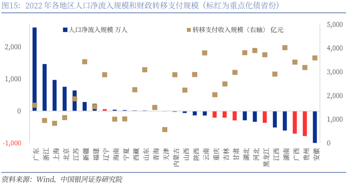 过去以来,我国财政转移支付对于人口净流出地区规模较大,一定程度上造成了基建过剩和公共服务的区域内结构性失衡,经济发达地区虽然财政收入较高,但相对持续流入的人口而言公共服务能力仍有较大缺口,而经济相对落后的人口净流出地区在转移支付的惯性下,基建相对人口而言实际过剩。而结合未来“以人为本”的新型城镇化战略推进,财政资源的区域间分配也将进一步建立“财随人走”的转移支付机制。
