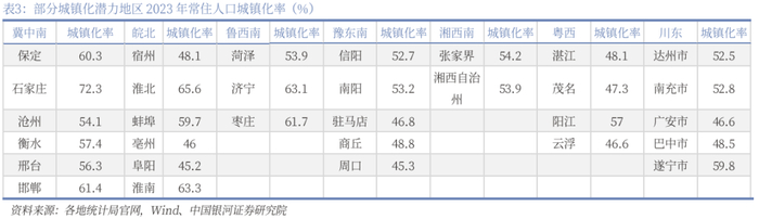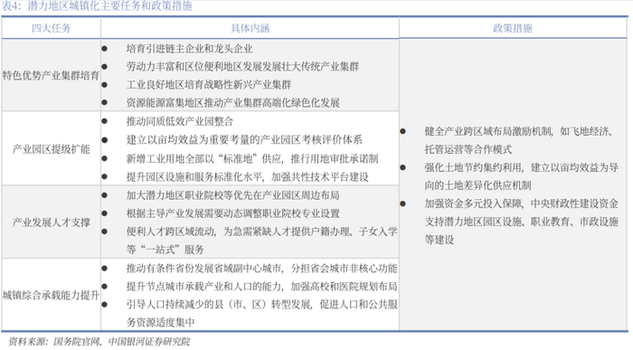 以产业发展为抓手,提升潜在地区城镇化水平是《计划》相比于其他政策的亮点之一。对比以往的城镇化政策,对产业政策的着墨较少。如国家发改委2022年印发的《“十四五”新型城镇化实施方案》,对于城市产业发展,尤其是潜力地区产业发展的表述较少,而产业发展通过吸纳就业可以为农业转移人口提供稳定的就业。《计划》和二十届三中全会的表述一脉相承,是统筹推新型工业化、新型城镇化和乡村全面振兴的具体体现。以潜力地区的工业化带动城镇化,也有助于实现乡村全面振兴。
