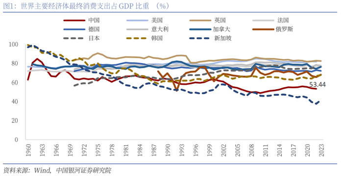 推动以人为本的新型城镇化可以有效扩大内需,助力构建新发展格局。经济高质量发展需要构建以国内大循环为主体的新发展格局。构建新发展格局需要充分发挥我国超大规模市场优势,激发内需潜力,这也是应对全球第五次产业链转移过程中地缘政治风险增加引致全球自由贸易受阻的必要举措。世界主要经济体的发展经验也表明,随着经济的不断发展,内需占GDP的比重会整体保持在比较高的比重。和其他发达国家相比,我国最终消费需求占GDP的比重仍然偏低。2022年我国最终消费支出占GDP的比重除高于新加坡外,均低于其他主要经济体。以美国和英国为例,2022年美国最终消费支出占GDP的比重为81.9%,英国为82.9%,分别比我国高28.4和29.4个百分点。