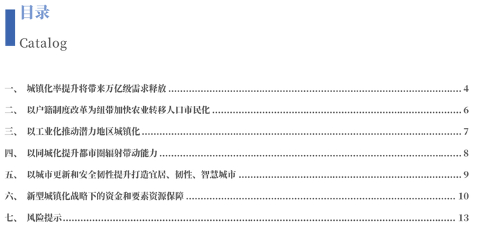 · 《计划》聚焦城镇化量的增长和质的提升:首先,深化户籍制度改革,推行以常住地登记户口制度,进一步拓宽城镇落户渠道,300万以下人口城市全面放开,300~500万人口城市全面放宽;其次,健全常住地提供基本公共服务制度,推动“相关公共服务随人走”,其背后需要财政“财随人走”的配套改革;第三,以工业化推动潜力地区城镇化,在冀中南、皖北、鲁西南、豫东南、湘西南、粤西等重点潜力地区因地制宜发展产业。第四,以“同城化”提升都市圈辐射带动能力,提升城际通勤效率、强化产业分工协作、加快市场一体化建设、推进公共服务共建共享。第五,实施城市更新和安全韧性提升行动,打造宜居、韧性、智慧城市。