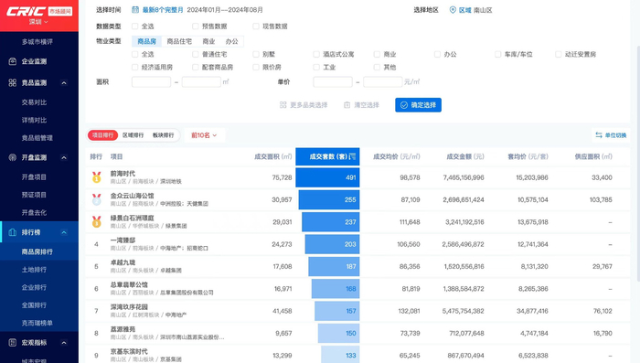 新房回暖趋势明显下,热门产品备受市场关注,核心区域的楼盘更是成为了资金热捧的对象。根据克而瑞的统计数据,今年1-8月深圳的豪宅销量排行中,绿景白石洲无论是成交套数或成交金额均位居前列。