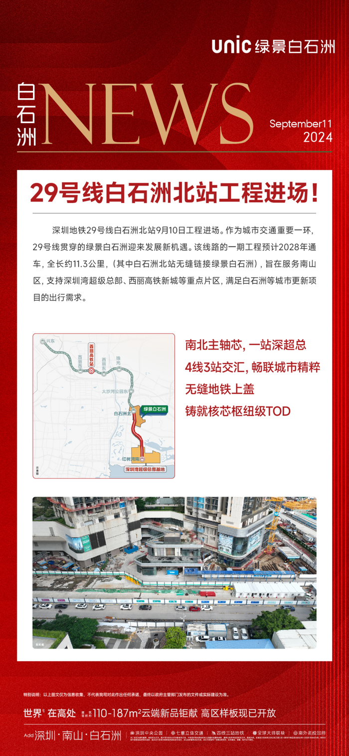 近日,29号线白石洲北站工程进场。作为深圳的“超级中心线”,29号线串联起深超总和大沙河,与绿景白石洲共同构建一座一站式的生活大城。