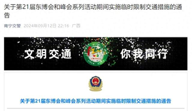 9月12日晚,南宁交警发布关于第21届东博会和峰会系列活动期间实施临时限制交通措施的通告。