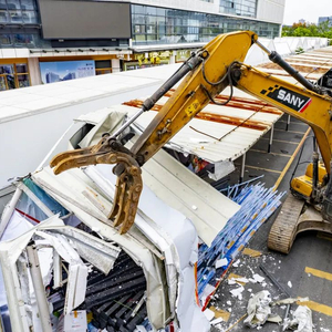 9月8日下午,记者在现场看到,工作人员已在兴发广场二期首拆区域拉起警戒线。在一阵轰隆隆的机械破拆声中,一台挖掘机将市场一侧的铁皮摊位安全拆除。兴发广场二期清拆工作由此全面展开。