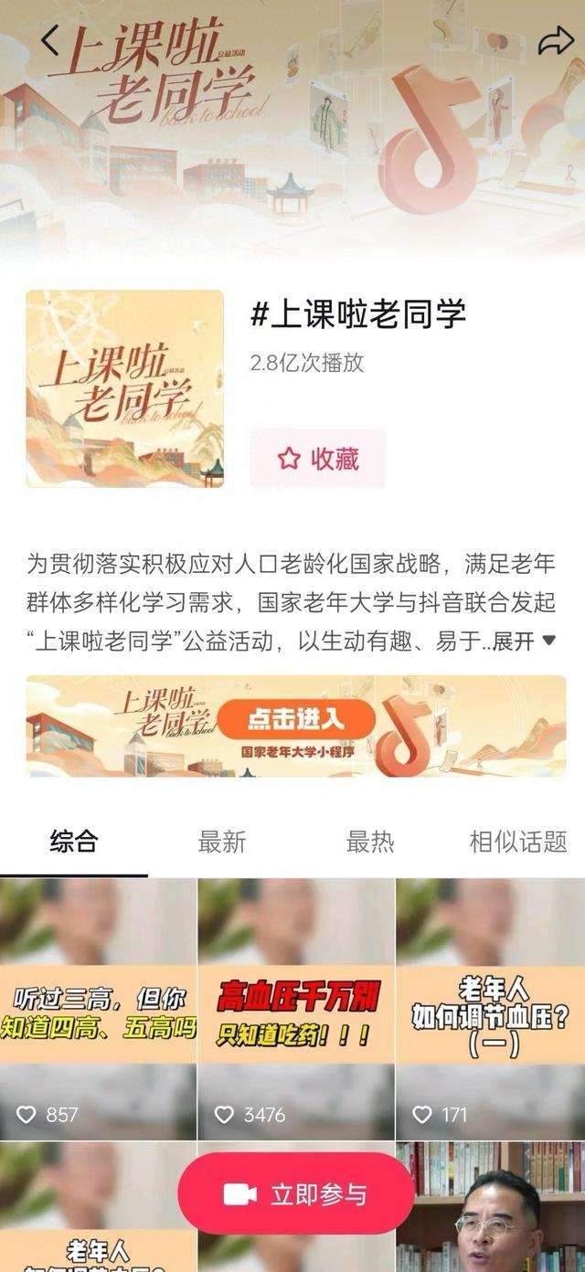 为共同服务老年用户,提供更适老、更科学的网络素养课程,提高老年群体的幸福指数,9月12日抖音集团和国家老年大学正式启动合作,发起“上课啦老同学”活动。抖音平台将选出养生健康、反诈科普、拍摄剪辑、国学文化、生活艺术、网络素养、家庭关系、人际交流等8个门类共105节精品视频,免费上传至国家老年大学平台提供给全国各地老年大学使用。国家老年大学的小程序也正式入驻抖音,未来将在抖音为老年用户提供更多优质课程。