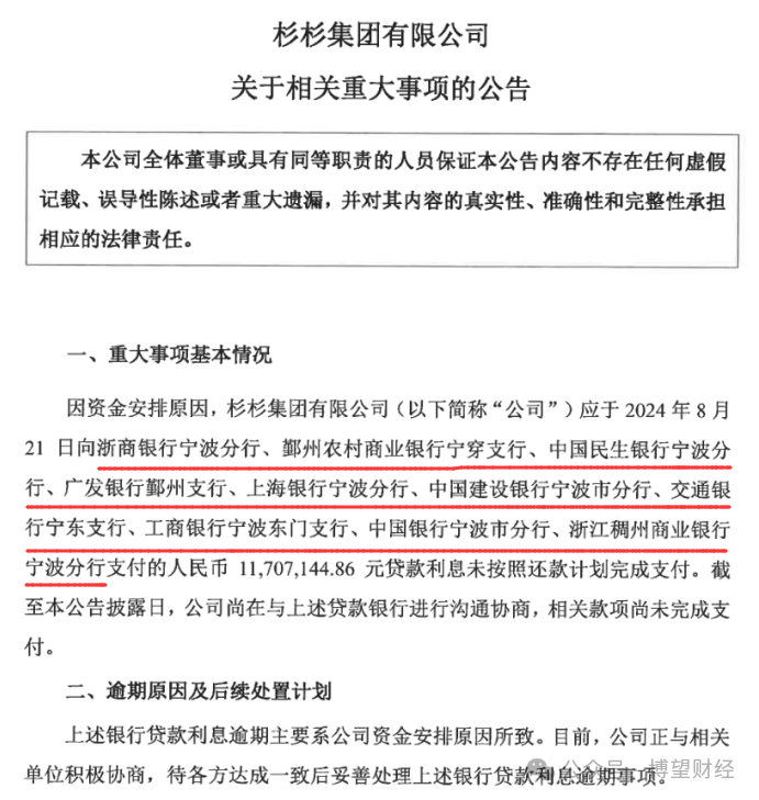 8月28日,杉杉集团发布公告称:原定于8月21日向多家银行支付的1170.7万元的贷款利息,未能如期完成支付。公告显示,共涉及10余银行家。