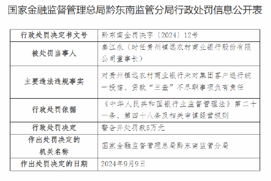 同时,针对上述违规事项,相关责任人也被问责。秦江永,作为时任贵州镇远农村商业银行股份有限公司的董事长,因对未对集团客户进行统一授信及贷款“三查”不尽职负有责任,被监管分局给予警告并罚款5万元。而杨俊松,作为时任该行行长,则因同样涉及未对集团客户进行统一授信、贷款“三查”不尽职以及贷款风险分类不准确等问题,被监管分局给予警告处分。