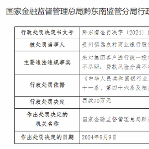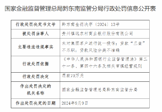 贵州镇远农村商业银行被罚70万元:未对集团客户进行统一授信、贷款“三查”不尽职、贷款风险分类不准确