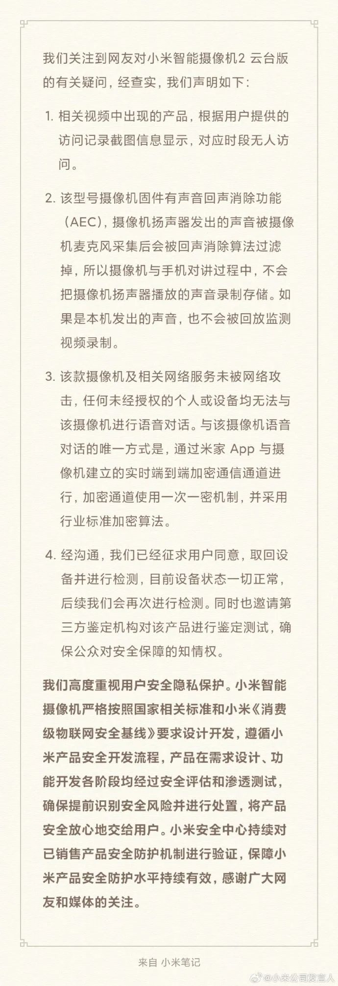 声明表示,该款摄像机及相关网络服务未被网络攻击,任何未经授权的个人或设备均无法与该摄像机进行语音对话。与该摄像机语音对话的唯一方式是,通过米家App与摄像机建立的实时端到端加密通信通道进行,加密通道使用一次一密机制,并采用行业标准加密算法。