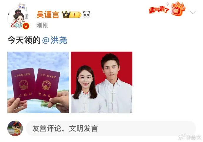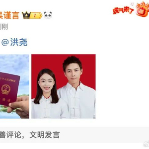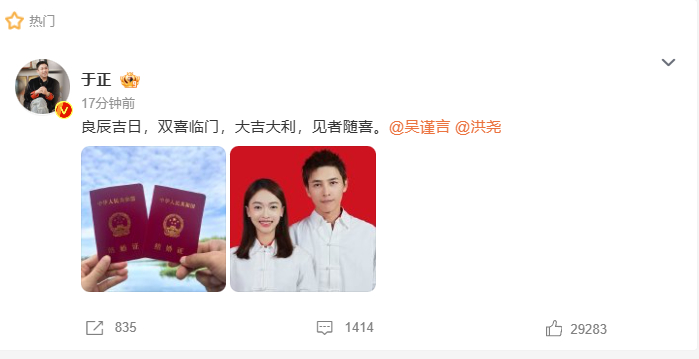 @吴谨言@洪尧 发博晒出结婚证,配文:“今天领的”,“今天结的”,并艾特彼此,甜蜜官宣结婚的好消息。