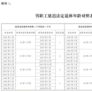 一、同步启动延迟男、女职工的法定退休年龄,用十五年时间,逐步将男职工的法定退休年龄从原六十周岁延迟至六十三周岁,将女职工的法定退休年龄从原五十周岁、五十五周岁分别延迟至五十五周岁、五十八周岁。