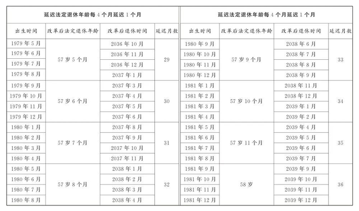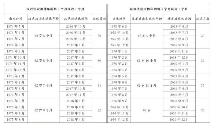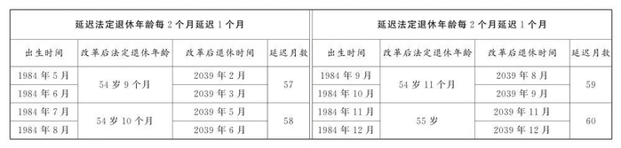 延迟法定退休年龄时间对照表公布