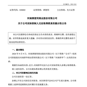 9月9日,河南酒便利商业股份有限公司发布公告称,公司收到控股股东河南侨华商业管理有限公司(以下简称“河南侨华”)出具的告知函。根据告知函的内容,近日,河南侨华无法与公司实际控制人余增云取得联系。