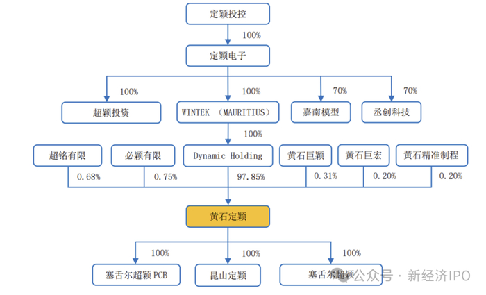 招股书显示,在超颖电子的股权控制路径中,最上层的是位于中国台湾的定颖投控(3715-TW),第二层是其全资子公司定颖电子股份有限公司,第三层是全资控股的离岸公司Wintek (MAURITIUS) Co., Ltd.;第四层是全资控股的新加坡公司Dynamic Electronics Holding Pte. Ltd.,该公司直接控制定颖电子(黄石)有限公司(即发行人)97.85%的股份。