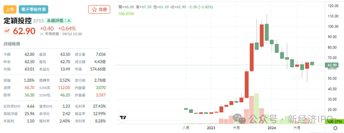向汽车行业用板转型虽然拯救了定颖电子,但是,2012年-2018年,定颖电子仅在2014年、2016年和2017年实现盈利,其余时间均亏损。这也让定颖电子在股市上不受投资人待见。2022年12月之前,定颖电子的市值约为17亿元人民币,日均成交金额约等于一两千万人民币。2022年末开始,受定颖电子赴祖国大陆上市以及其汽车营收占比稳步走高刺激,其股价从不到20台币一路上涨至100多台币,目前回落至60台币左右。用台湾某财经媒体的话说,这次股价大涨对定颖电子而言,无疑是“戏棚下站久了终于轮到当了一次主角”。可是,即便在股价涨了2倍后,定颖电子目前的市值也只有39亿元人民币,日均成交额相当于八、九千万元人民币。