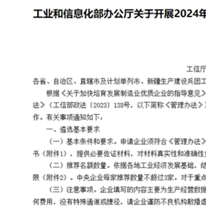 9月4日,工业和信息化部办公厅关于开展2024年制造业单项冠军企业遴选认定和复核评价工作的通知正式发布。