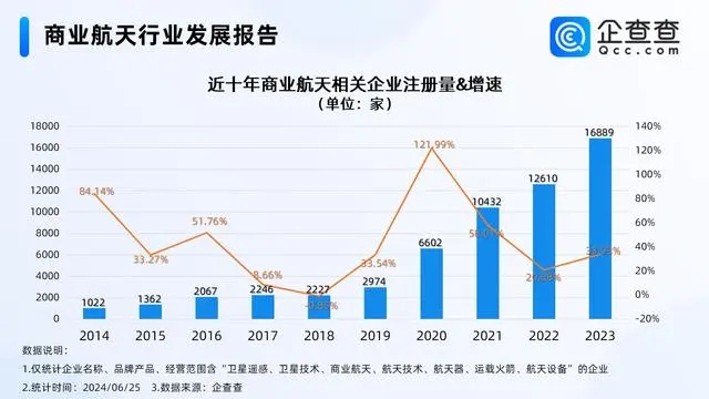 短短10年,国内商业航天在短短几年内迅速崛起,形成了初具规模的产业体系。企查查数据显示,我国现存商业航天相关企业6.07万家,相关企业注册量从2014年的1022家逐步增长至2023年多16889家,10年前注册量增长了16倍有余。