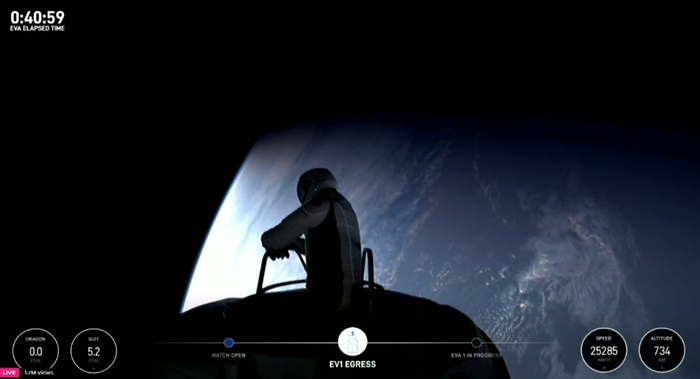 据央视新闻报道,该任务由现年41岁的美国亿万富翁艾萨克曼和该公司一工程师出舱进行。通过“天行者”(Skywalker)梯子,以及12英尺长的系绳,艾萨克曼率先走出太空舱,并在舱外待了10多分钟。随后,吉利斯出仓,同样在舱外待了10多分钟,以测试SpaceX宇航服的性能。