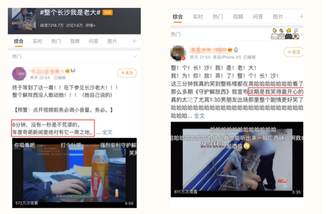 话题#整个长沙我是老大#热搜总榜最高排名第4,同时登上同城榜热搜第1,微博话题阅读量高达1.2亿;话题#守护解放西再度喜提热搜,同时登上热搜娱乐榜,微博话题阅读量1.8亿,累计视频播放量超过2000万。此外,还有#毒贩被捕喊妈妈#等多个话题霸屏微博热搜,累计7个话题在周六节目播出当天热搜长达4小时。