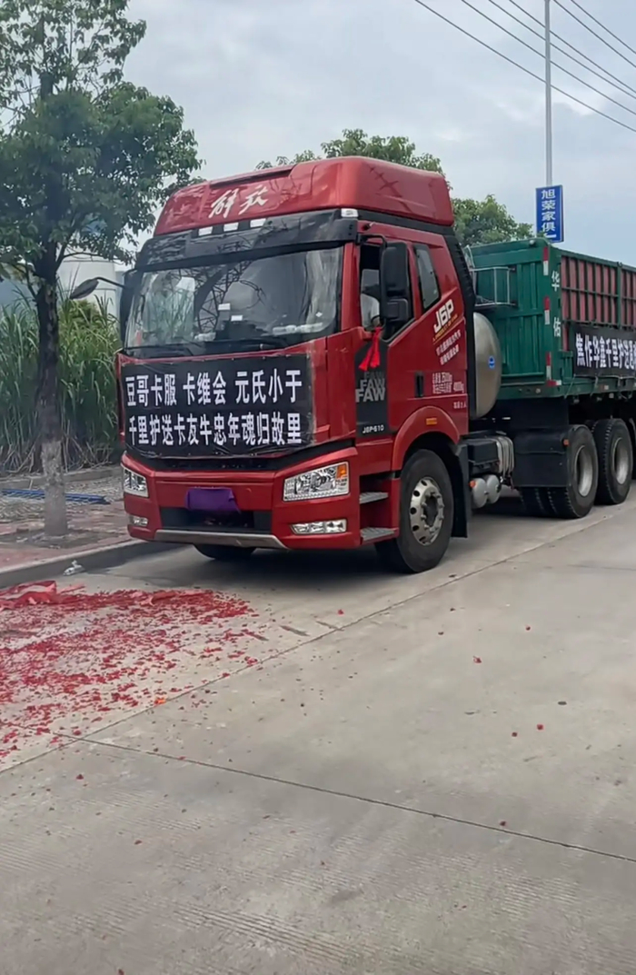 8月14日中午12点,在派出所民警的见证下,小于正式从家属手里接过车钥匙。出发之前,一条黑底白字的条幅被贴在车头,“千里护送卡友魂归故里”。