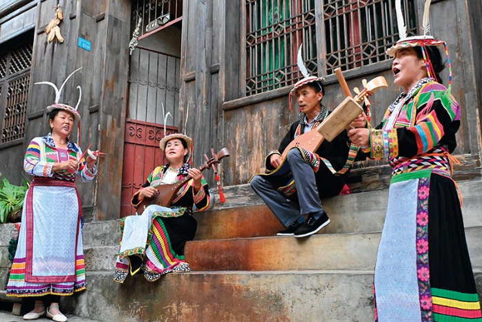 在甘肃省陇南市文县铁楼藏族乡,白马藏族村民自发组成的三弦弹唱团演奏当地歌曲(2024年7月2日摄) 《瞭望》新闻周刊 徐皓夫 摄