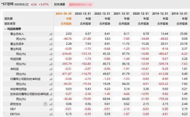 不过年报显示,*ST景峰2023年全年实现营业收入6.57亿元,同比减少21.86%;实现归母净利润为亏损2.15亿元,同比减少75.54%。2023年全年的营收仅为巅峰期2018年全年营收的五分之一左右。今年上半年,该公司继续亏损,上半年实现营业收入2.03亿元,同比减少46.76%;实现归母净利润为亏损0.24亿元,同比减少85.25%。