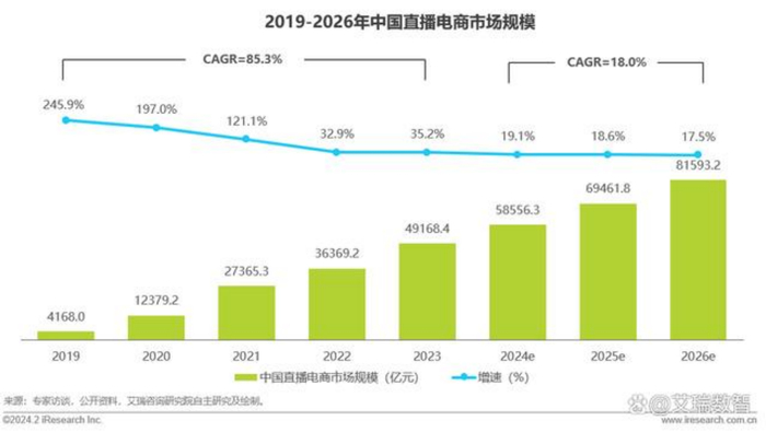 艾媒咨询的报告显示,2023年中国直播电商市场增速为35.2%,2024年预计增速将进一步降至19.1%。
