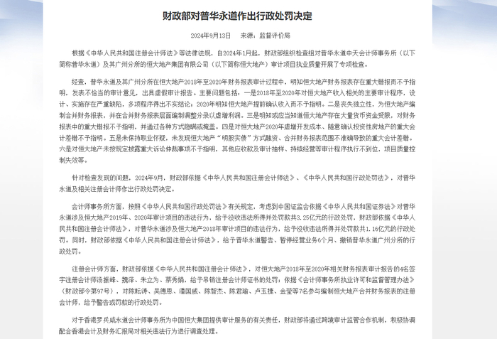 同日,财政部也公布了针对普华永道的处罚决定。针对普华永道涉及恒大地产2018年审计项目的违法行为,财政部给予没收违法所得并处罚款共1.16亿元的行政处罚。同时,给予普华永道警告、暂停经营业务6个月、撤销普华永道广州分所的行政处罚。