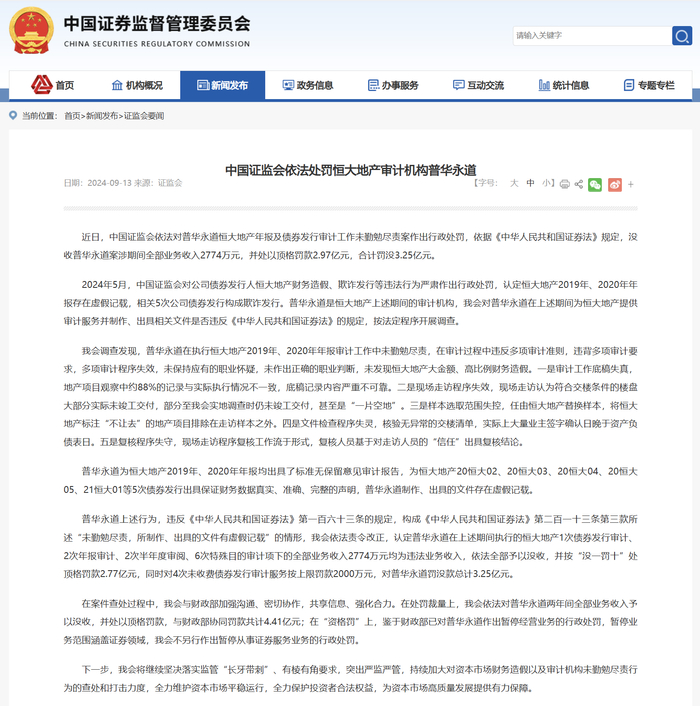 9月13日,证监会发布了对普华永道的处罚结果,决定没收普华永道案涉期间全部业务收入2774万元,并处以顶格罚款2.97亿元,合计罚没3.25亿元。