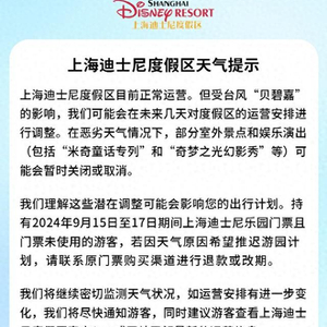 上海迪士尼度假区表示,对这些潜在调整可能会影响游客出行计划表示理解。持有2024年9月15日至17日期间上海迪士尼乐园门票且门票未使用的游客,若因天气原因希望推迟游园计划,请联系原门票购买渠道进行退款或改期。