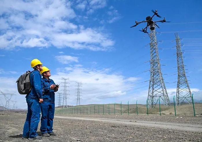 4月25日,在新疆乌鲁木齐市达坂城区,国网乌鲁木齐供电公司输电运检中心的无人机飞手哈依那尔·木那特(右)与同事使用无人机巡视220千伏达清泉输电线。新华社记者 陈朔 摄