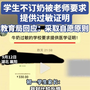 据媒体报道,9月12日,有网友发视频称,湖北省襄阳市老河口市第四中学初一年级老师要求学生订牛奶,一学期330元,不订牛奶的学生要提供牛奶过敏医学证明。