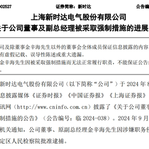 新时达(002527.SZ,股价5.89元,市值39.05亿元)9月13日公告,2024年9月12日,公司接到公安机关通知,公司董事、原副总经理金辛海因涉嫌职务侵占罪,已被上海市嘉定区人民检察院批准逮捕。