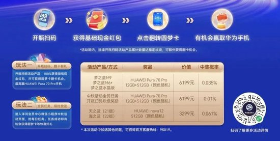 当前酒企动销的重要策略就是扫码红包,消费者买酒开瓶后扫瓶盖码,即可获得一定数额的现金红包,中奖概率一般为100%,多数酒企还设定大奖,奖品有汽车、笔记本电脑、手机等,抽中大奖的概率较低。以洋河正在进行的“中秋团圆喝洋河,万部华为抢先得”活动,大奖即华为手机;截止8月24日,洋河官微宣布已有上百万人参与了中秋扫码活动,1007部华为手机已经送出,以最高中奖概率0.061%来计算,可能已经有165万瓶洋河酒被开瓶了。